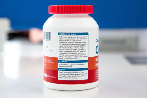 CoQ10 helps support heart function and helps promote energy production of ATP (adenosine triphosphate), especially in the heart. Stress, free radicals, statin medications, and aging can impact CoQ10 levels. CoQ10 is very important for the creation of energy, muscular contraction and the synthesis of protein.